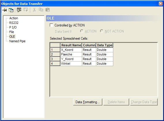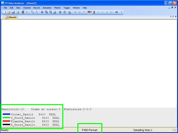 The channel list in the description area of the FP Data Analyzer must always match with the Vision P400 settings in the OLE interface property page “Objects For Data Transfer”.