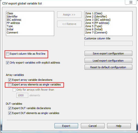 Deactivate the two options "Export column title as first line" and "Export array elements as a single variables"