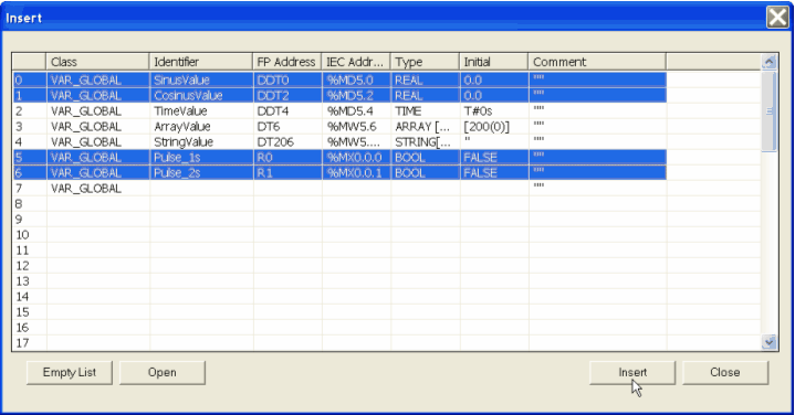 Insert PLC variables to record with [Insert] or double-click a single line to insert