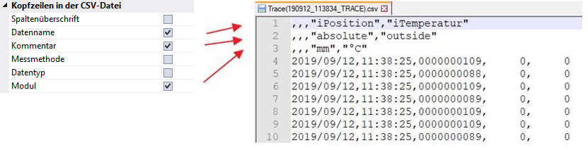 Wählen Sie die Kopfzeilen aus, die in der CSV-Datei verwendet werden sollen. Nicht aktivierte Kopfzeilen erscheinen in der CSV-Datei nicht, auch nicht als leere Zeilen.