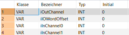 Diese Funktion schreibt digitale Werte in den Ausgangskanal des Analogmoduls und liest digitale Umwandlungswerte aus dessen Eingangskanälen. Die digitalen Werte, die umgewandelt und als analoge Werte ausgegeben werden sollen, werden bei iOutChannel festgelegt. Die digitalen Umwandlungswerte aus dem Analogmodul werden je nach Kanal in den Ausgangsvariablen iInChannel0 und iInChannel1 gespeichert.