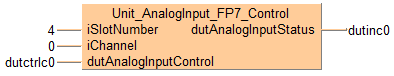 Diese Funktion liest die im SDT unter dutAnalogInputControl angegebenen Stellwerte für den ausgewählten Kanal und gibt Statuswerte unter dutAnalogInputStatus aus. Die Funktion ist optional und kann verwendet werden, um die Einstellungen, die im Dialogfeld E/A-Adressen und Modulkonfiguration von Control FPWIN Pro7 vorgenommen wurden, zu überschreiben.
