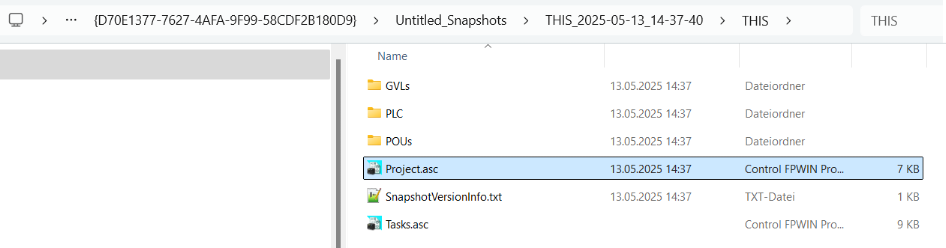 Control FPWIN Pro7 legt jeweils einen Ordner für Schnappschüsse und Vergleichsdateien relativ zum Projektpfad an. Der Ordnername besteht aus dem Projektnamen, dem Schnappschuss-Typ und einem Zeitstempel (nicht unbedingt in dieser Reihenfolge), z.B. <project name>_Snapshots\<snapshot type>_yyyy-mm-dd_hh-mm-ss.