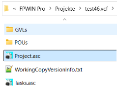 Ein Projekt unter Versionsverwaltung wird in Control FPWIN Pro7 auf seine zugehörige Ordner- und Dateistruktur "ProjectName.vcf" (Projektarbeitskopie genannt) in denselben Speicherort gespiegelt, an dem das Projekt abgelegt ist: