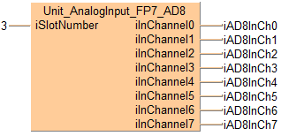 This function reads converted digital data from the analog input channel of the analog unit in the slot specified by iSlotNumber. The converted digital values are stored per channel in the output variables iInChannel0 to iInChannel7.