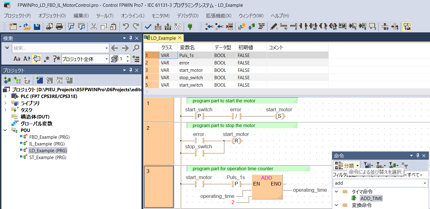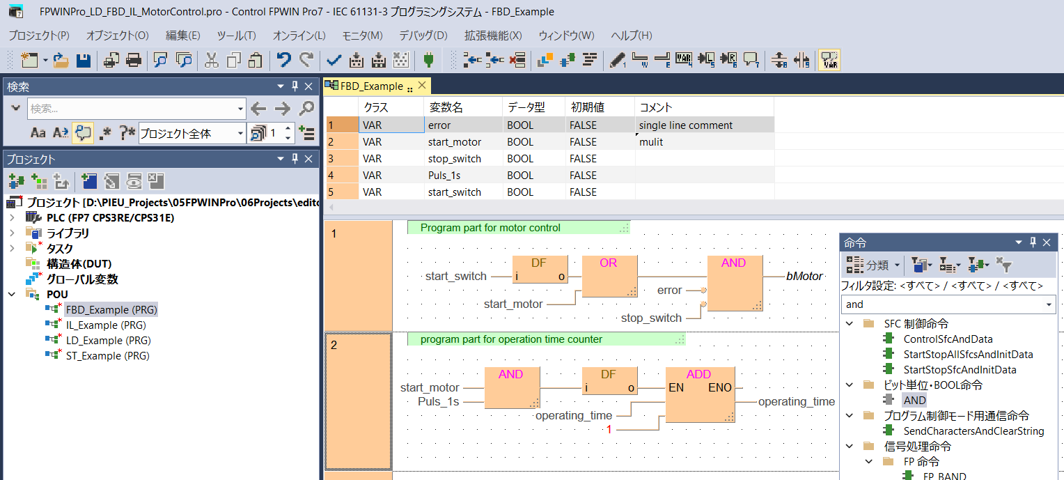 FBDは類似するプログラミングエレメントを使用しますが、母線、接点、コイルはありません。このセクションの使用例や説明は、特に記載のない限り、LDを基準としています。