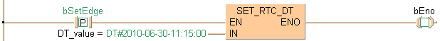 SET_RTC_DTは、クロック/カレンダ機能に対してPLCのリアルタイムクロック値を設定します。PLCにリアルタイムクロック機能がない場合、あるいは働いていない場合は、演算結果は無効な日時の値となります。