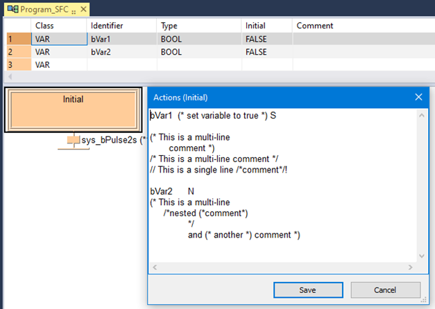 액션은 부울 변수 또는 LD, ST, IL 또는 FBD의 액션 프로그램일 수 있고 스텝에 할당되어야 합니다. 스텝을 활성화할 때마다 할당된 액션이 실행됩니다. 부울 변수에 할당된 액션 한정자를 액션 제어에 할당할 수 있습니다.