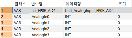 이 펑션블록은 아날로그 유닛의 아날로그 입력 채널에서 변환된 디지털 값을 읽습니다. 변환된 디지털 값은 출력 변수 iInChannel0~iInChannel3에 채널별로 저장됩니다.