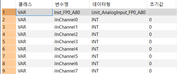 이 펑션블록은 아날로그 유닛의 아날로그 입력 채널에서 변환된 디지털 값을 읽습니다. 변환된 디지털 값은 출력 변수 iInChannel0~iInChannel7에 채널별로 저장됩니다.